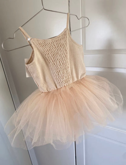 100% cotton bodice, tulle trim ballerina style that sticks out.